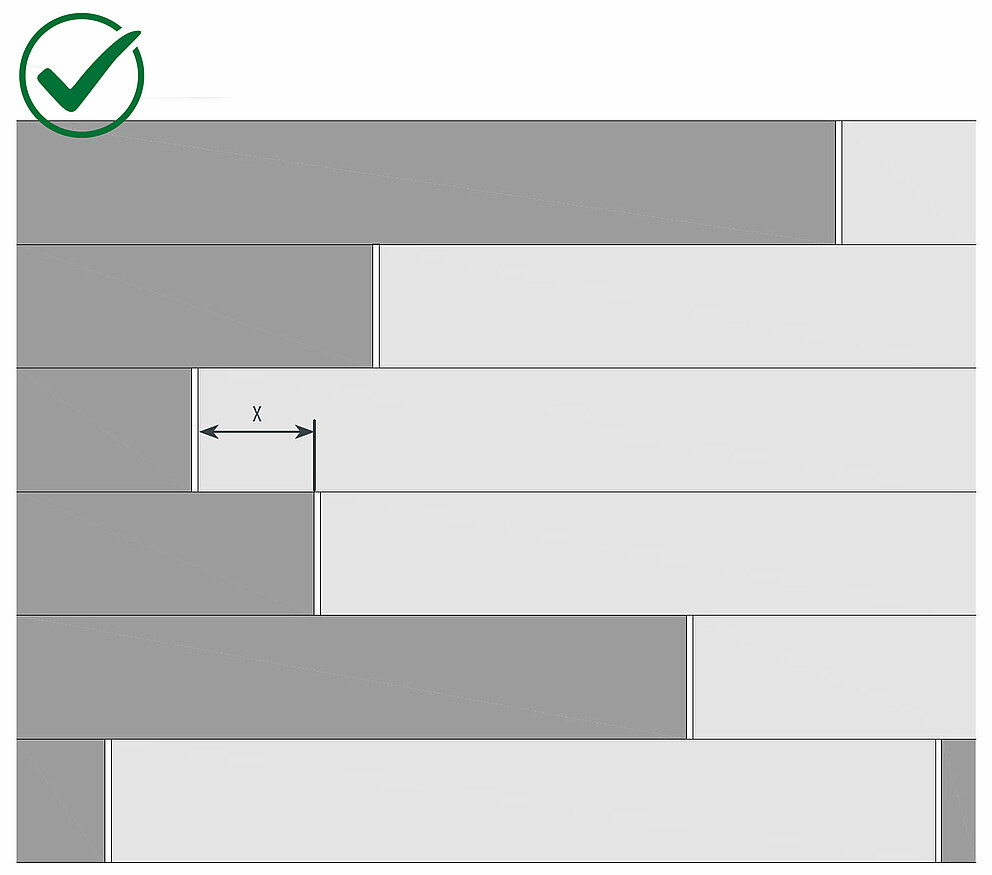 PREFA odporúča, aby bol posun (x) min. vo vzdialenosti rovnajúcej sa konštrukčnej šírke (KŠ) montovaných prvkov (napr. pri lamele Siding 138 × 0,7 mm = min. posun 138 mm):