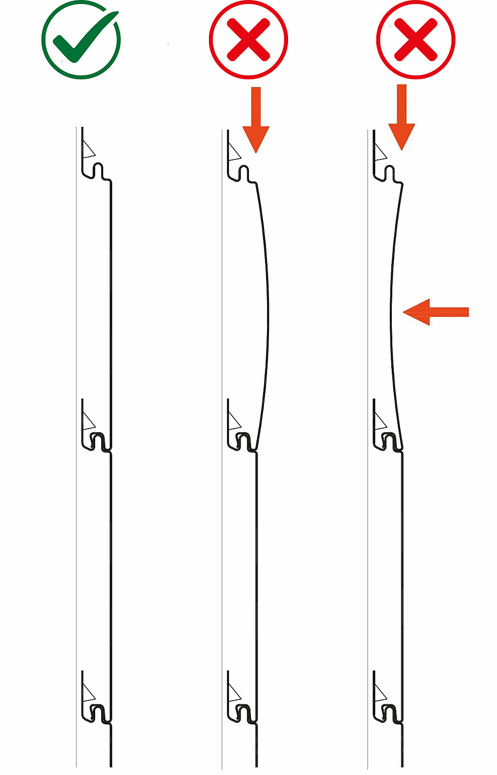Dbajte na to, že pri montáži sa nesmie používať tlak. Lamely Siding, Siding.X a Siding perforovaný nezasúvajte do seba tlakom, pretože by to mohlo viesť k deformácii. Lamely Siding musia k podkladovej konštrukcii priliehať úplne rovno, aby sa predišlo ich konkávnej a konvexnej deformácií.