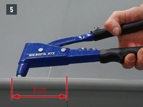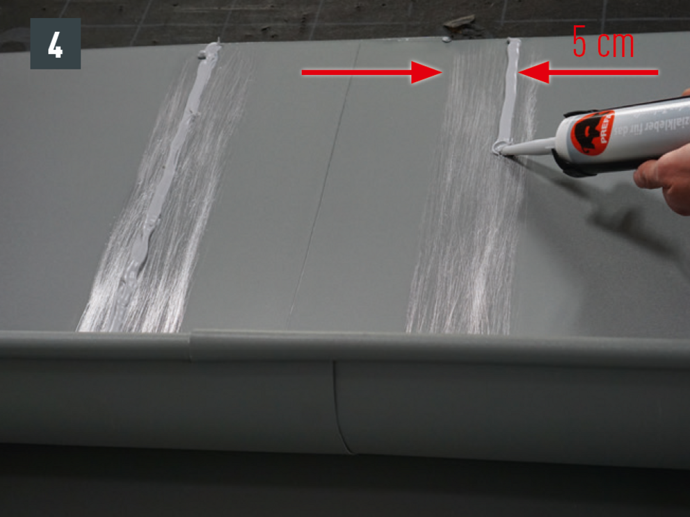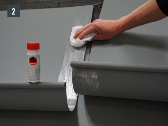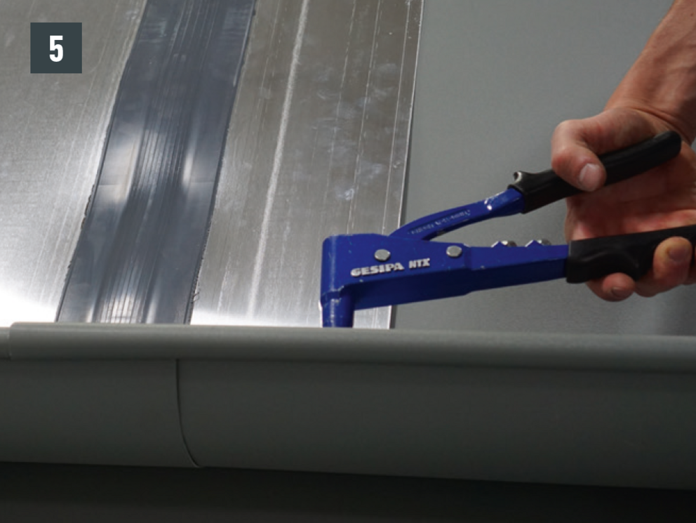 Spájanie nástrešného žľabu možno vytvoriť aj nitovaním pomocou 20 kusov trhacích nitov PREFA 4 x 9,5 mm do kríža s utesnením pomocou špeciálneho silikónu PREFA.