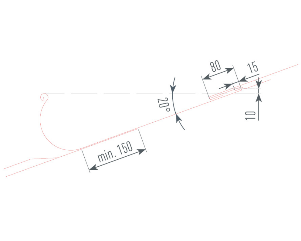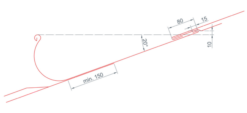 Treba dbať na to, aby spätný ohyb na strane strechy bol o 10 mm vyšší ako je predná strana nástrešného žľabu. Z toho pre nástrešný žľab PREFA vyplýva minimálny sklon strechy 20° (pozri obrázok dole).