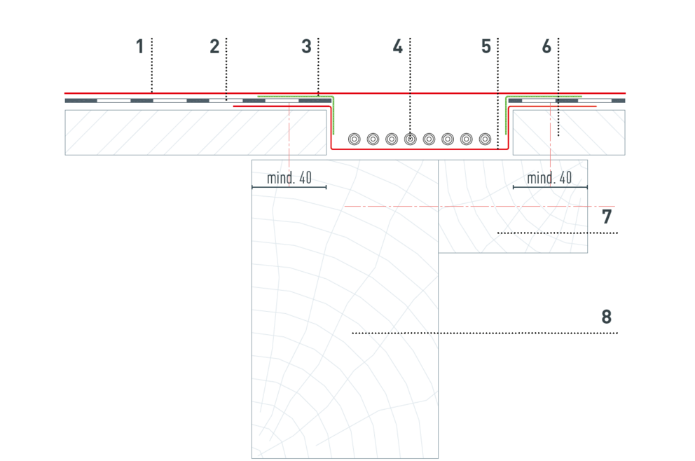 Z dôvodu potrebného vedenia kábla je potrebné drevenú podkonštrukciu vyhotoviť podľa nasledujúceho detailu. Počet a polohu káblových kanálov definuje technické oddelenie PREFA a zobrazí sa v montážnom pláne FV.