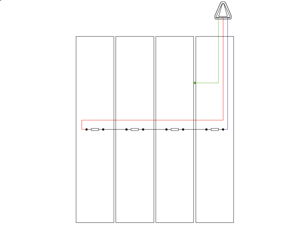 Zariadenie solárneho modulu PREFALZ potrebuje vždy jednu vetvu na prívod a odvod. Na nasledujúcom schematickom náčrte kabeláže je kvôli ľahšiemu pochopeniu prívod znázornený modrou farbou, odvod červenou farbou, vyrovnanie potenciálu zelenou farbou, ako aj modulové vedenia čiernou farbou.