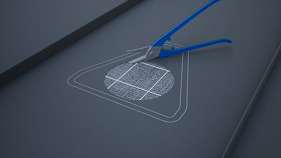 Umiestnenie priestupového prvku solárnych vedení a vyznačenie obrysu. Následne vyznačte oblasť lepenia (25 mm) a výrez rúrovej manžety. Vystrihnutie a zalemovanie kruhovej oblasti nahor.