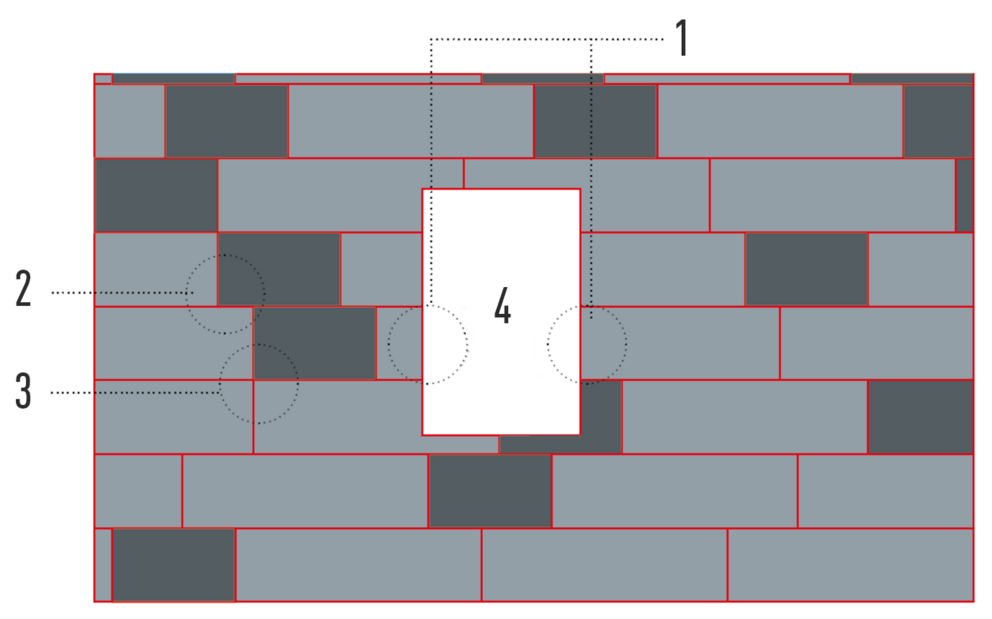 Odrezaný panel FX.12 bol znovu použitý (1) na druhej strane otvoru (4). To znamená, že správne rozloženie spojov už nie je zaručené (2) a v najhoršom prípade môže viesť k prekrývaniu spojov (3). Preto boli vytvorené príklady pokládky na optimálny posun spojov.