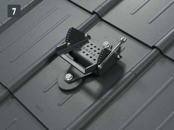 Neumiestňujte a neupevňujte podperu na falc alebo hrebeň vlny strešnej krytiny PREFA. Môže byť potrebné nainštalovať spevňovaciu podložku (napr. ak je v oblasti krokiev falc alebo hrebeň vlny).