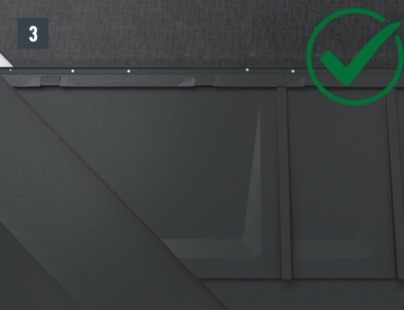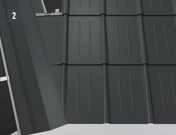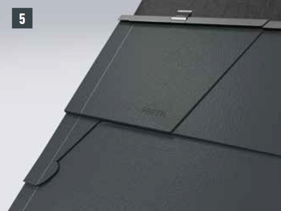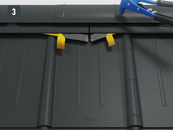 Posledný (v prípade potreby skracovaný) rad panelov upevnite pomocou spätnej príponky priamym upevnením vedľa vrcholu vlny podloženej vlny (pri PREFA falcovaných škridlách) alebo priamym upevnením nad penový klin odvetrávacieho hrebenáča Jet-Lüfter.