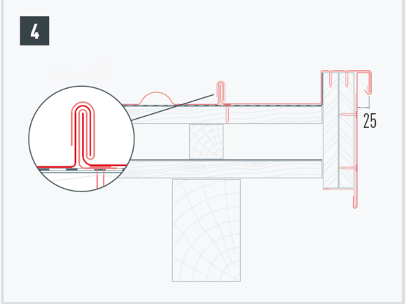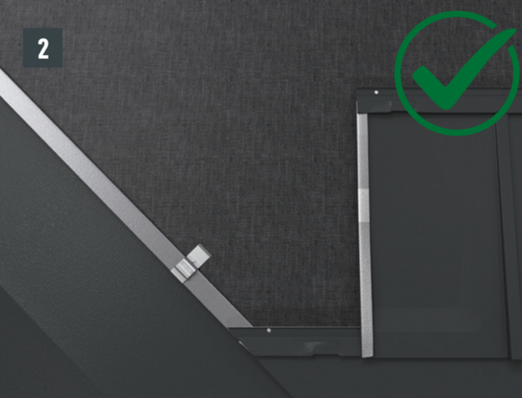 V súvislosti s tým je potrebné upozorniť, že oblasť určená pre bočné vyhnutie (napr. pre pripojenie záveternej lišty) sa nesmie nachádzať v oblasti falcu strešného panela R.16 alebo strešného panela FX.12 V prípade potreby posuňte podkladový pás o štvrtinu rozmeru strešného panela R.16 alebo strešného panela FX.12.