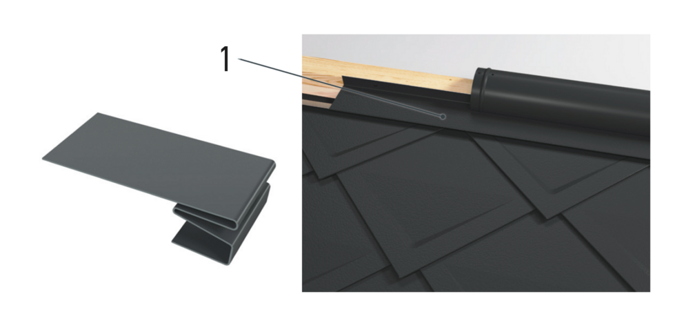 Ak má byť na falcovanej škridle namontovaný priebežný štítový plech, musí byť horný spätný ohyb škridle zarovnaný tak, aby bolo možné zavesiť rovný štítový plech.
