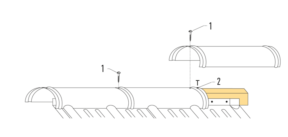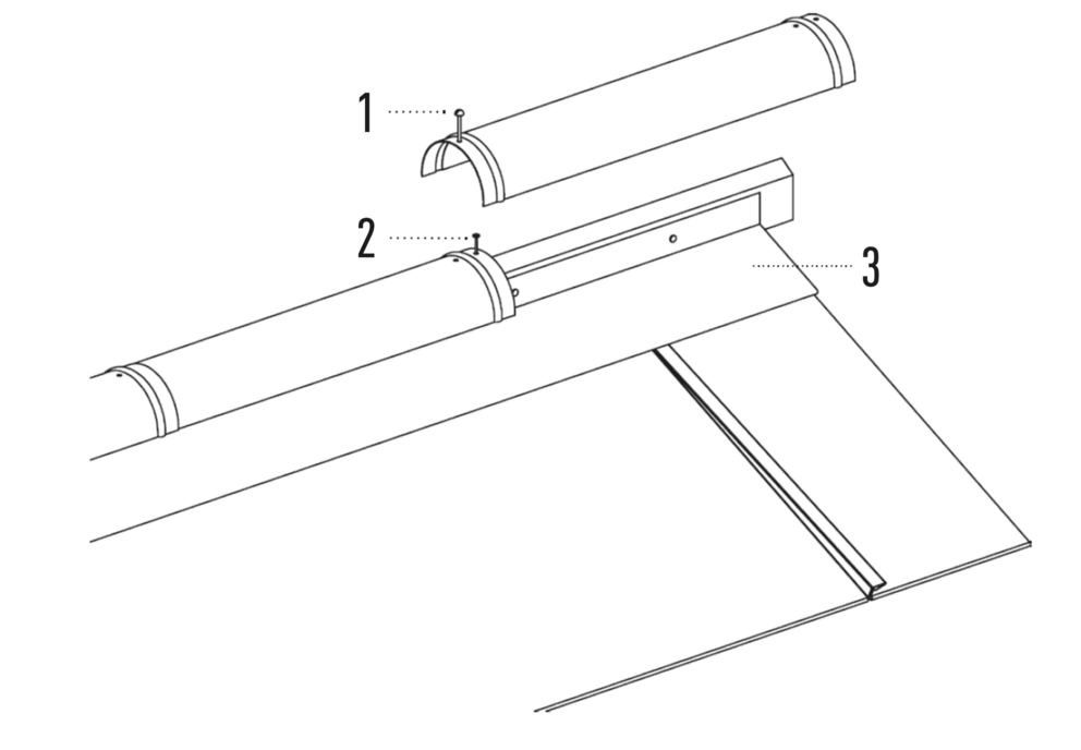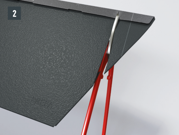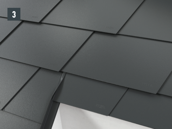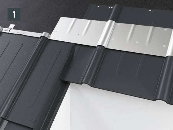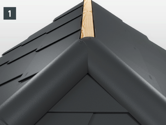 Ak je vzdialenosť medzi strešnou krytinou PREFA a bodom hrebeňa menšia ako 150 mm a nie je potrebné odvetrávanie, môžete použiť jednoduchý hrebenáč na hrebeň.