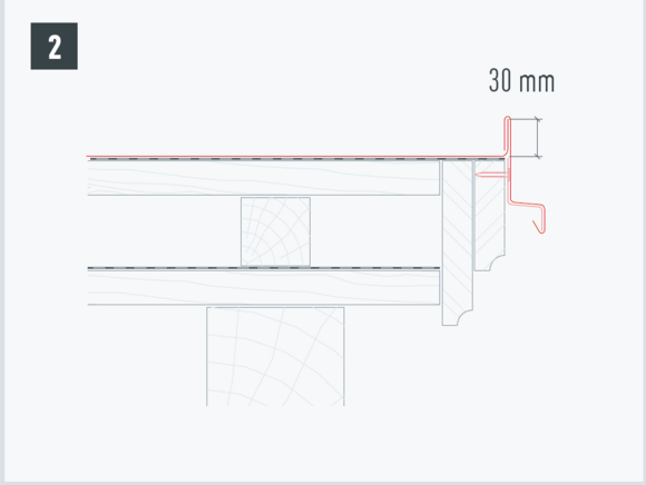 Odkvapový presah podkladového pásu by mal byť v zadnej tretine šírky žľabu a nesmie presiahnuť 80 mm.