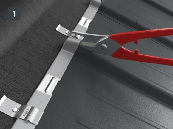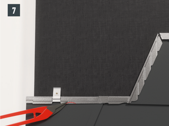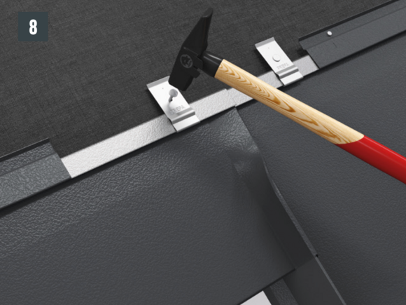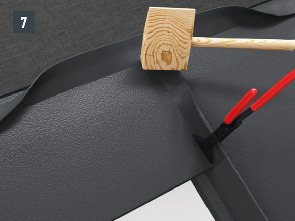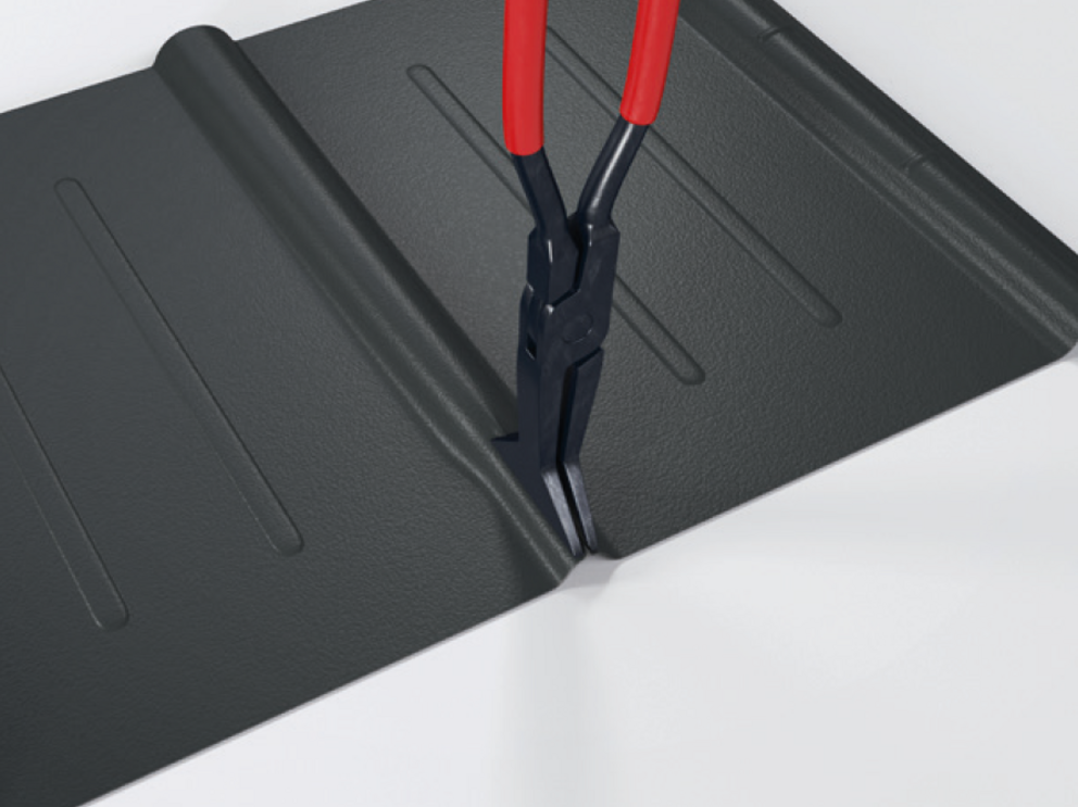 Po skrátení falcovanej škridle stlačte jej strednú vlnu a potom záhyb položte, aby ste vytvorili závesnú drážku. Stlačený záhyb môžete vytvoriť pomocou falcovacích klieští alebo tiež pomocou ryhovacieho a vrúbkovacieho stroja.
