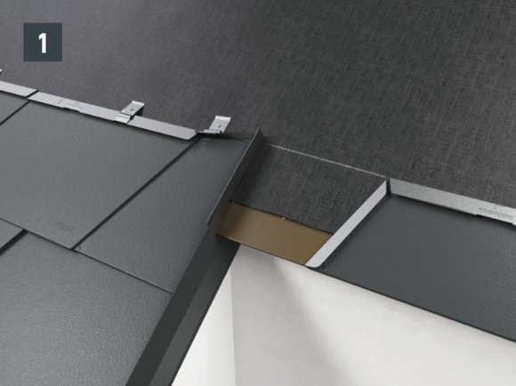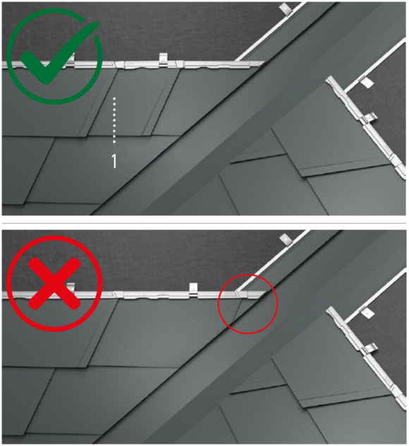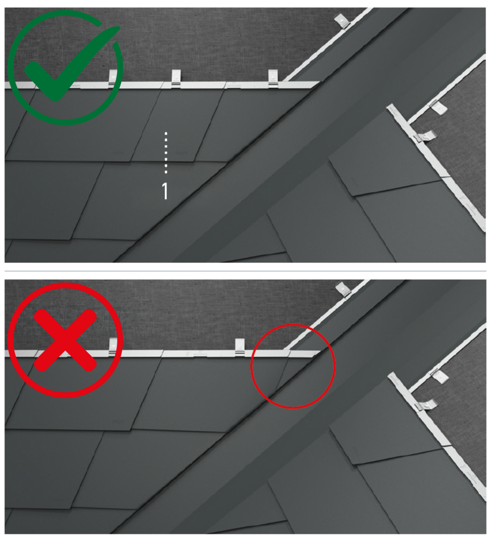 Ak na ľavej strane úžľabia vychádza styčný bod úžľabie/spoj šindľa, musíte pri strešných šindľoch vopred vyrobiť a namontovať skrátený strešný šindeľ (1), resp. pásový šindeľ (1).