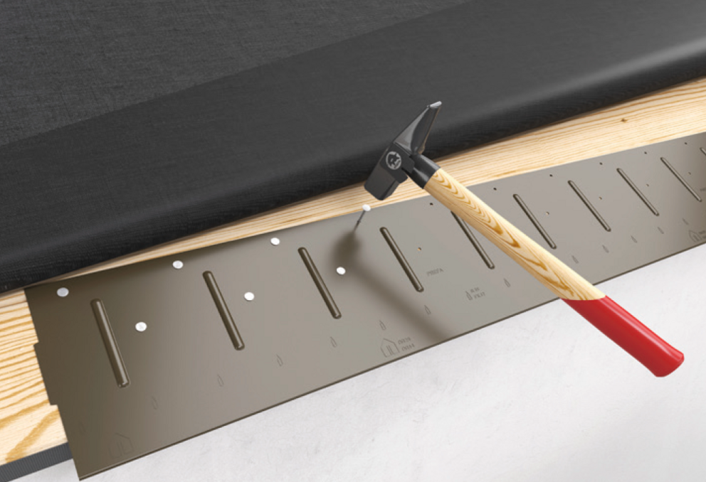 Podkladový pás musí byť pribitý tak, aby odolal búrke (priklincujte všetky vopred vyrazené otvory). Pred pribitím všetkých vopred vyrazených otvorov priloženými klincami PREFA provizórne upevnite celý podkladový pás.
