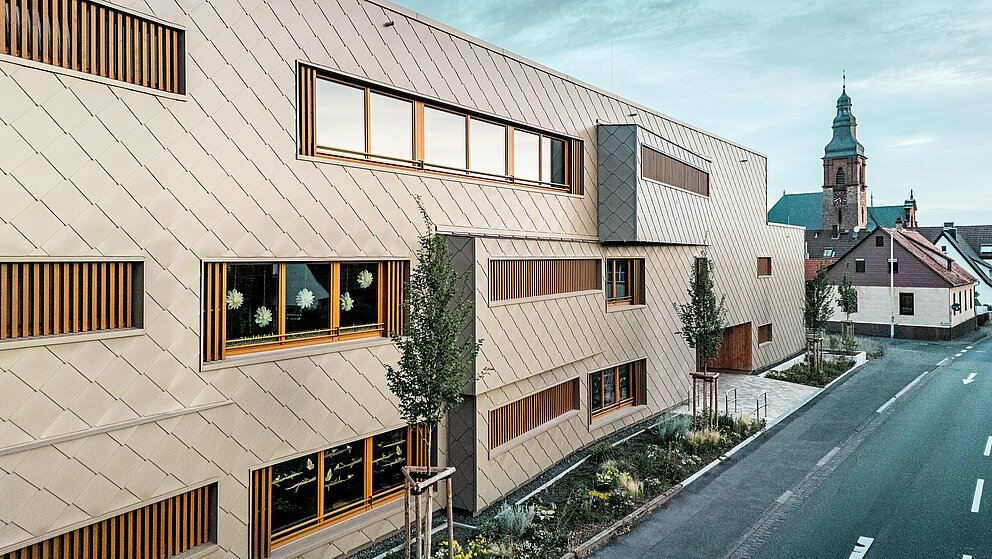 Výzvou boli rôzne pôdorysné geometrie a statické rastre, rozdielne vedenia inštalácií a prenos zaťaženia cez spodné podlažia. Zavesená hliníková fasáda z PREFA fasádnych šablón 44 × 44 v bronzovej farbe mala opticky spojiť jednotlivé funkčné časti hybridnej budovy do harmonickej jednoty. „Keď sa pozriete na celý životný cyklus, PREFA je jednoducho na čele, pokiaľ ide o energetickú náročnosť a recyklovateľnosť,“ pochvaľuje fasádny systém Claudia Härtner – plne si uvedomujúc ekologickú hodnotu materiálov šetriacich zdroje a prispievajúcich k ochrane klímy, vždy v kontexte konkrétneho miesta použitia.