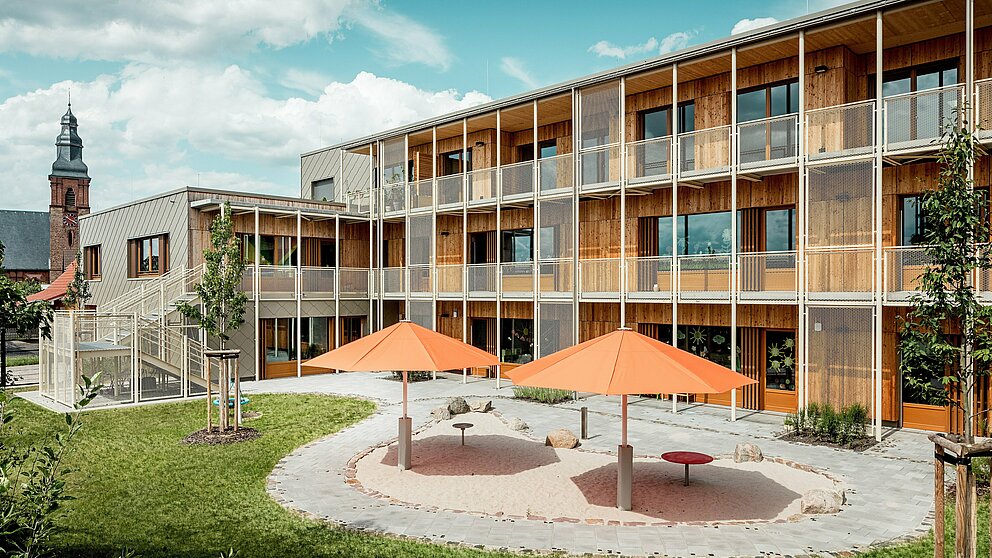 Nová materská škola nemala poskytovať len priestor na stretávanie vhodný pre najmenších, ale aj adekvátny obytný priestor pre zamestnancov blízkeho nemocničného komplexu. „Páči sa nám, keď sa kombinujú viaceré funkcie, no často sa ukazuje, že podporné mechanizmy, postupy prideľovania a očakávania rozhodovacích orgánov predstavujú trvalé výzvy,“ hovorí Theo a Claudia Härtner. Výzva ako stvorená pre architektonický pár, pretože sa špecializujú nielen na novostavby materských škôl, základných škôl a vzdelávacích inštitúcií, ale aj na riešeniami orientovaný dialóg a diskusiu s kompetentnými orgánmi.
