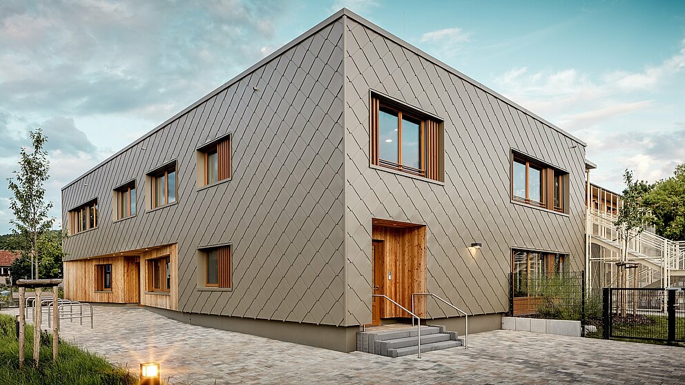 Bronzový hliníkový plášť budovy realizovala klampiarska firma ASA Schüßler. Táto tradičná franská remeselná firma už úspešne zrealizovala druhý projekt PREFARENZEN v Alzenau. Na hybridnú budovu bolo namontovaných približne 3 500 bronzových PREFA fasádnych šablón s rozmermi 44 × 44 centimetrov – každá z nich bola jednotlivo, skryto upevnená pomocou ryhovaných klincov PREFA na plné drevené debnenie. Početné rohy budovy a ostenia sú riešené pomocou kapsových profilov a štandardných rohových líšt.