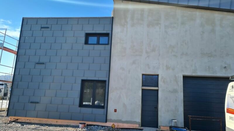Práve sa realizuje klampiarska dielňa v Námestove, ktorá zároveň slúži aj ako sídlo firmy A-AMB s.r.o.. Majiteľ sa rozhodol pre produkty firmy PREFA, s ktorými rád pracuje a svoju budovu si sám opláštil PREFA fasádnym panelom FX.12 vo farbe svetlošedá P.10. Na lemovanie okien a pre lišty zvolil ako kontrast zvitkový plech PREFALZ v antracitovej farbe s povrchovou úpravou P.10, na ktorú firma PREFA poskytuje 40 ročnú záruku. Pred samotnou realizáciou klampiar využil službu PREFA FOTOSERVIS, aby si bol istý výsledným efektom oboch odtieňov. Odvodnenie balkónov je riešené hranatým odvodňovacím systémom PREFA v rozmeroch 250/80mm v antracitovej farbe. Spojením jednotlivých produktov v dvoch rozdielnych odtieňoch klampiar docielil oživenie budovy s moderným nádychom.