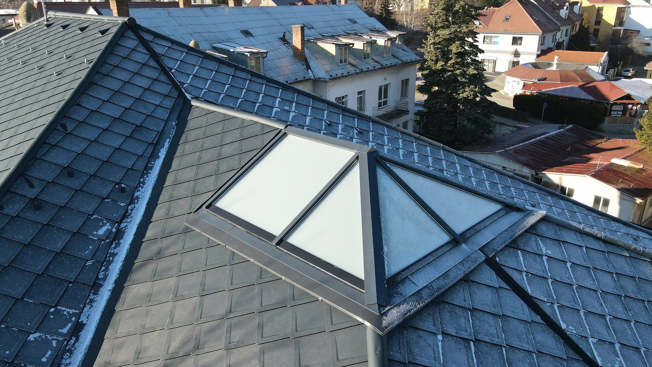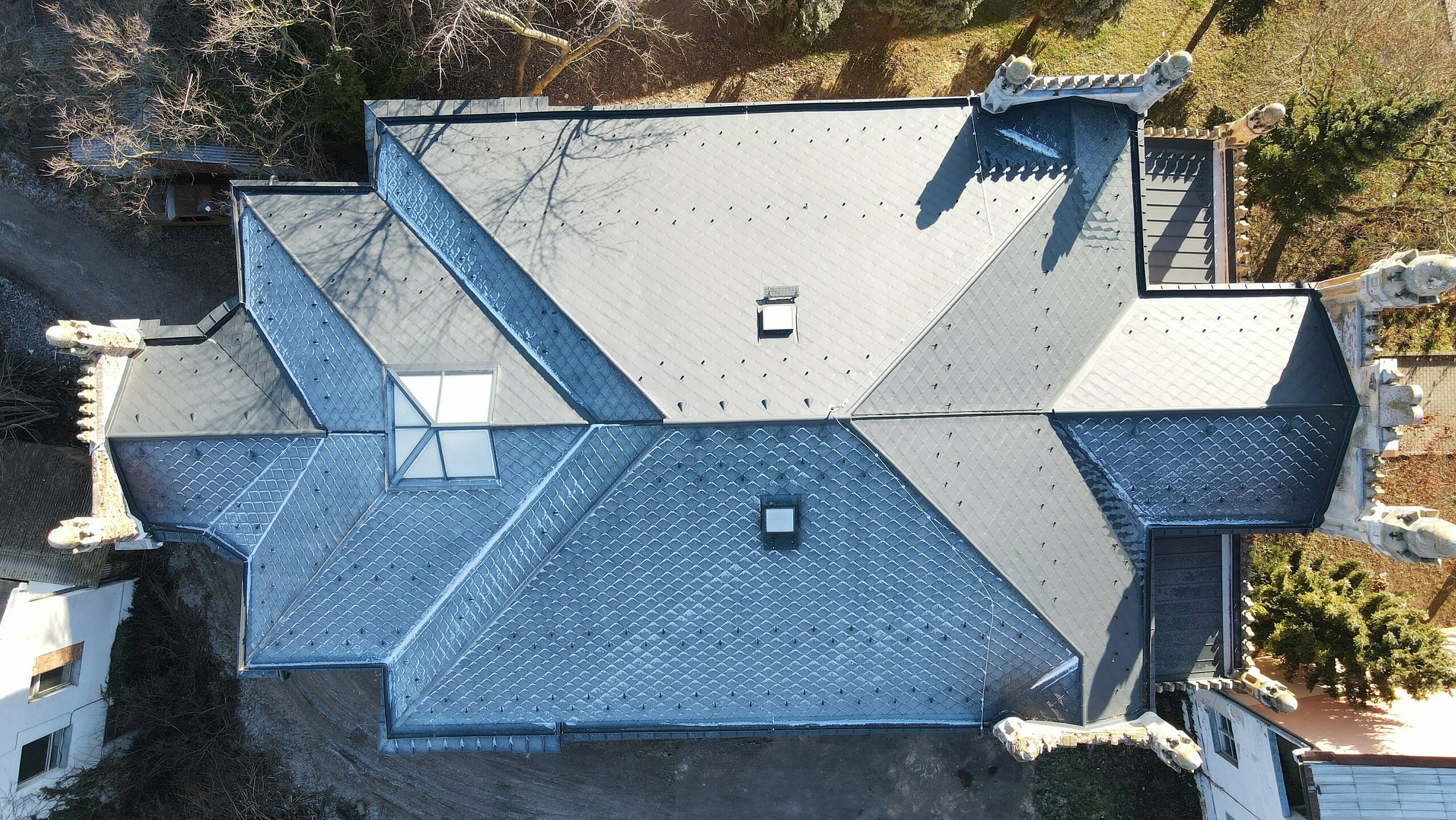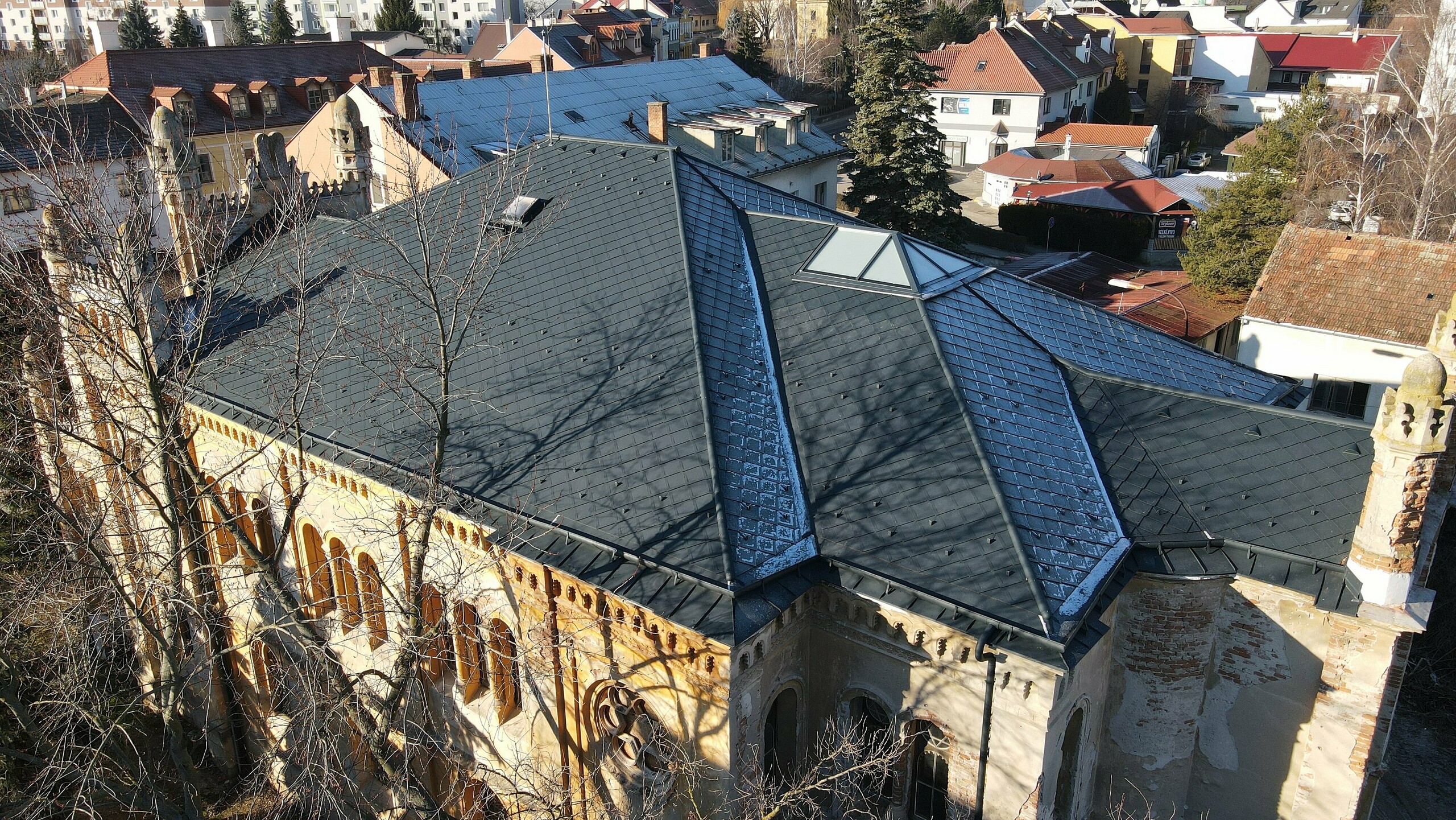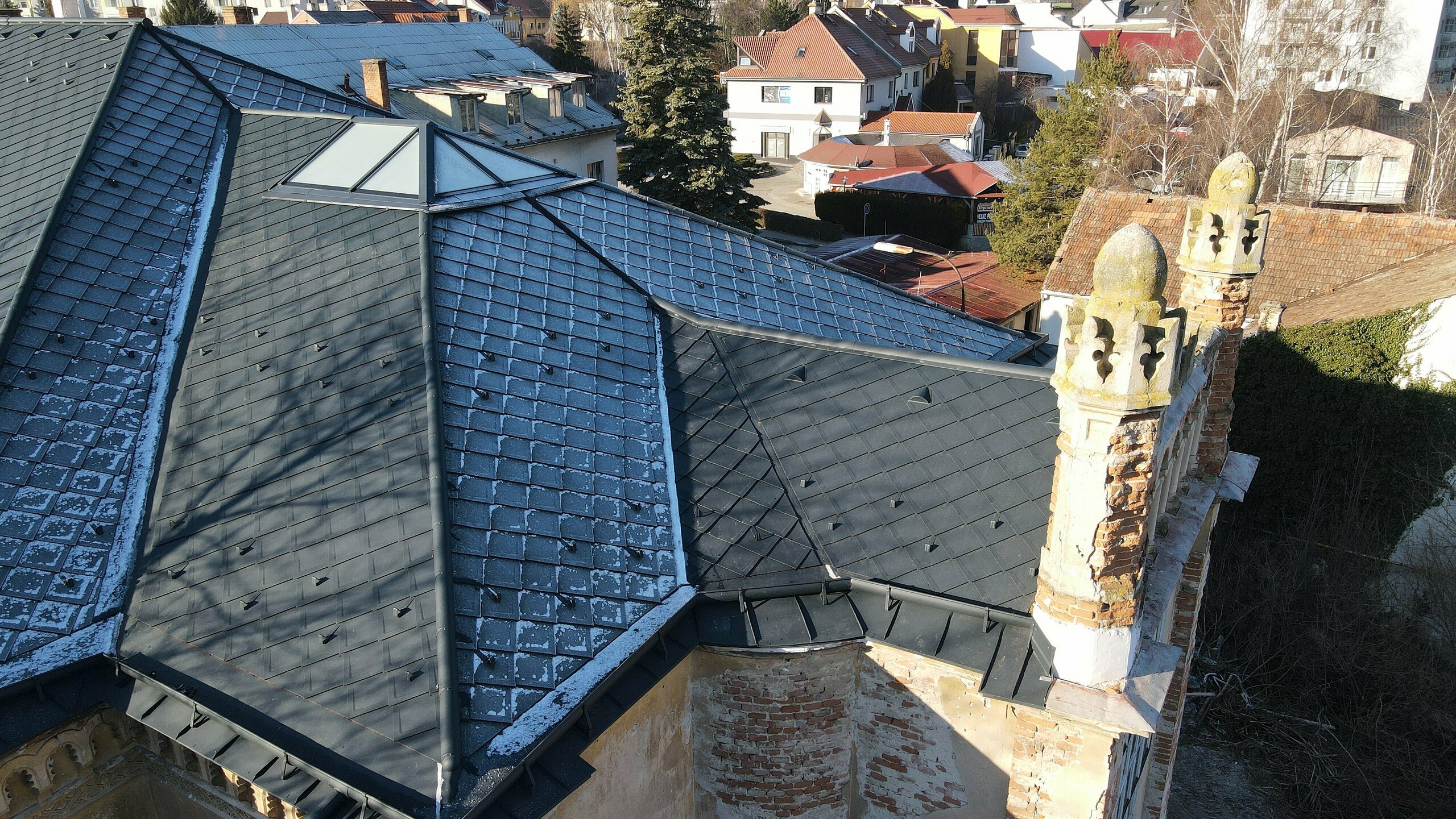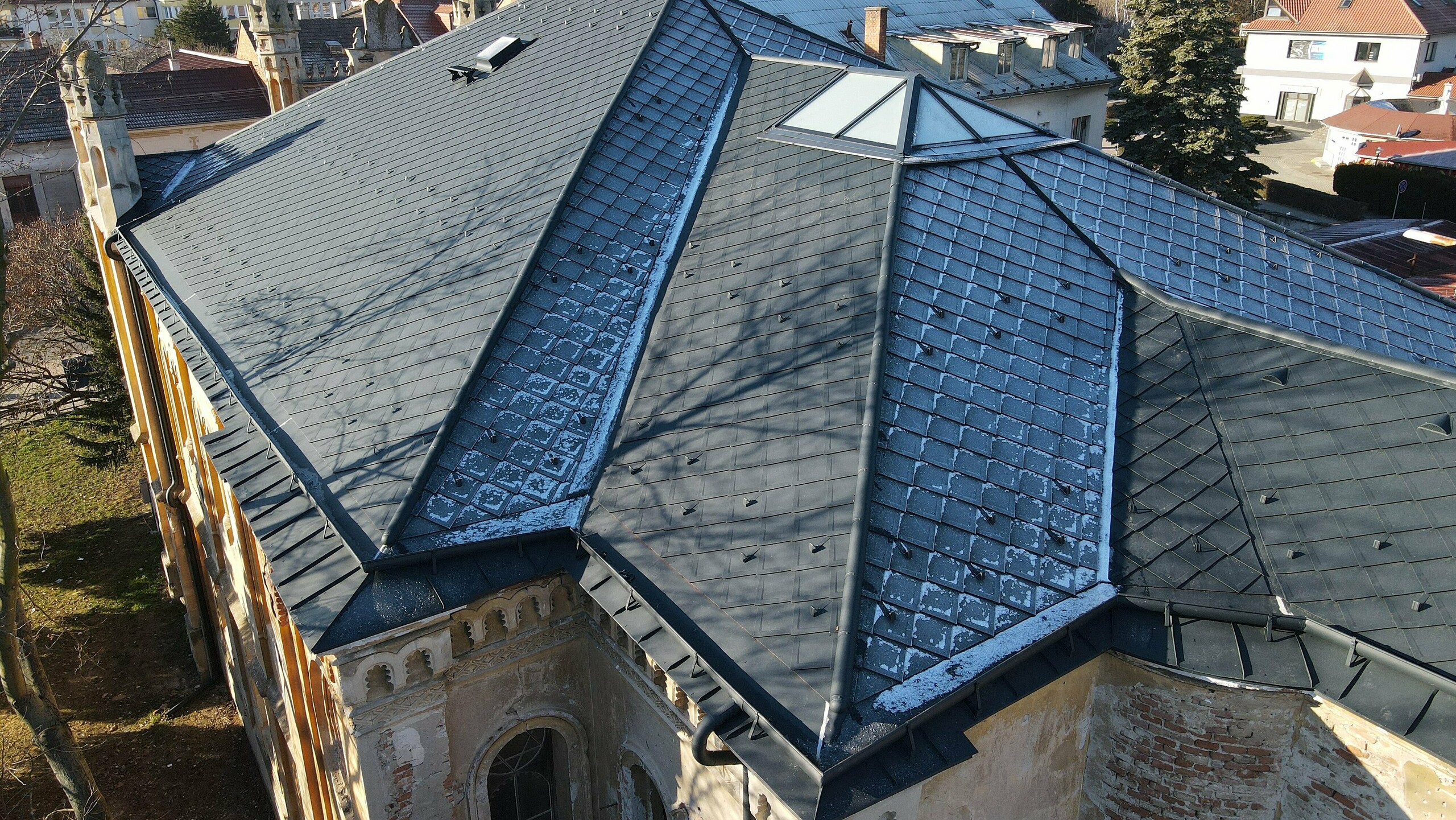 Podľa technického a statického posudku musel byť najskôr opravený krov. Pre jeho odľahčenie bolo treba nájsť ľahkú strešnú krytinu, ktorá bude spĺňať požiadavky pamiatkovo chránenej kultúrnej pamiatky. Voľba padla na strešnú krytinu PREFA – strešná šablóna 29x29 (cca 450 m2) vo farbe antracit s povrchovou úpravou P.10 v prevedení stucco, ktorej hmotnosť na 1m2 je približne 2,6kg. PREFA ponúka kompletný sortiment výrobkov, a tak bola strešná krytina skombinovaná s nástrešnými žľabmi spolu s falcovaným plechom PREFALZ taktiež v odtieni antracit P.10.