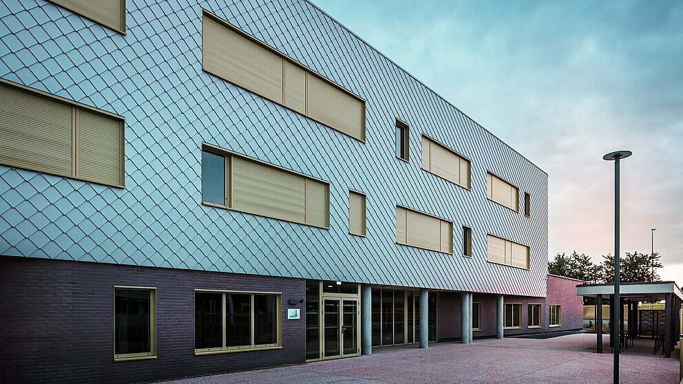 Riešenie spočívalo v kombinácii dvoch materiálov: hnedastý klinkerový obklad v spodnej časti budovy a striebristá hliníková fasáda v hornej časti. Toto dvojité členenie dodáva budove určitú eleganciu a zároveň sa vyznačuje stabilitou a praktickosťou pre každodenné použitie. Fasádu tvorí približne 15 000 kusov PREFA fasádnych šablón 29 x 29 v odtieni strieborná metalíza. To predstavuje viac ako 1 375 metrov štvorcových hliníka, ktorý bol navrhnutý, vyrobený a namontovaný. Meniaci sa kov vytvára živý povrch, ktorý sa v závislosti od dopadu svetla leskne v rôznych farbách oblohy.
