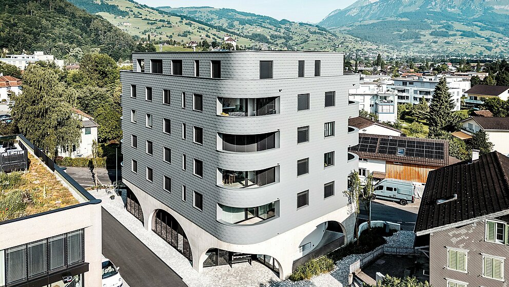Novostavba kombinuje poctivú masívnu konštrukciu s výnimočným vzhľadom. Ten je daný jednak trojuholníkovým pôdorysom budovy bez ostrých rohov. Na druhej strane jej „šupinatá hadia koža“ z drobných fasádnych šindľov PREFA v odtieni P.10 svetlošedá, vytvára rovnomerne obiehajúcu kovovú fasádu, ktorá je skutočným lákadlom. Navyše ide o dobrú voľbu, pretože vďaka svojmu formátu je možné šindle ukladať aj v úzkom rádiuse, čo umožňuje zaoblené rohy. „Priamo za našou budovou sa začínajú tradičné švajčiarske rodinné domy – a tie sú u nás pokryté šindľami,“ vysvetľuje Keller svoje kreatívne dizajnové rozhodnutie.