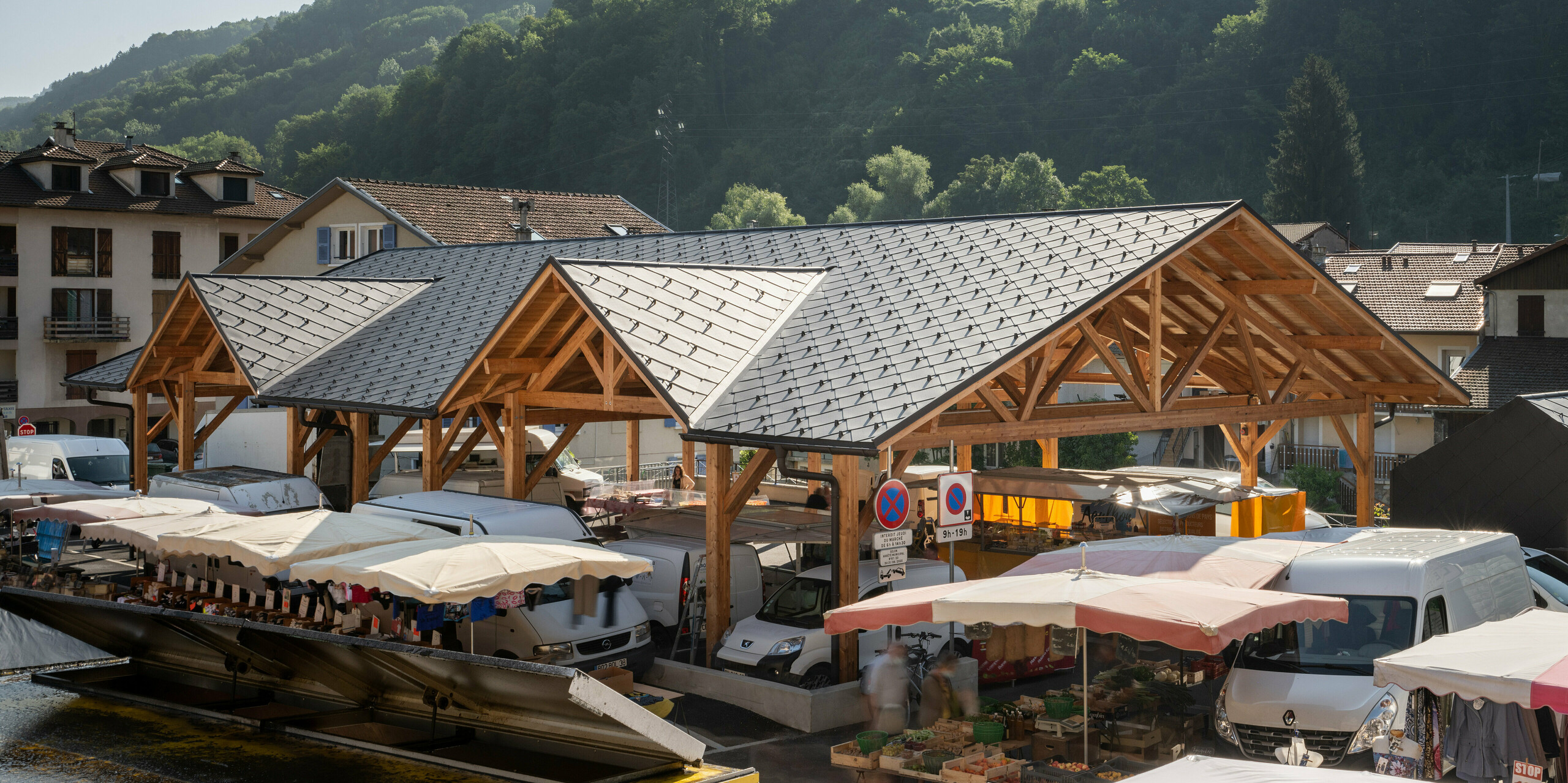 Na veľkom parkovisku so staromódnymi verejnými toaletami vzniklo miesto pre stretnutia a pohostinnosť. Krytá hala Allevard, kúpeľného mesta v departemente Isère, bola pokrytá strešnou šablónou PREFA 44x44 vo farbe orieškovohnedá P.10. Strecha haly je farebne zladená so strechami mesta a dodáva námestiu elegantný a súčasný vzhľad.